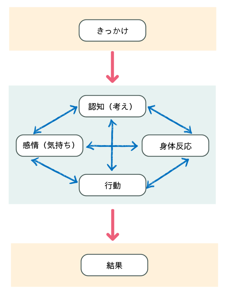 CBTでは、何か「きっかけ(状況や出来事)」が起こった時に、人間には以下の4つの反応が生じるとしています。