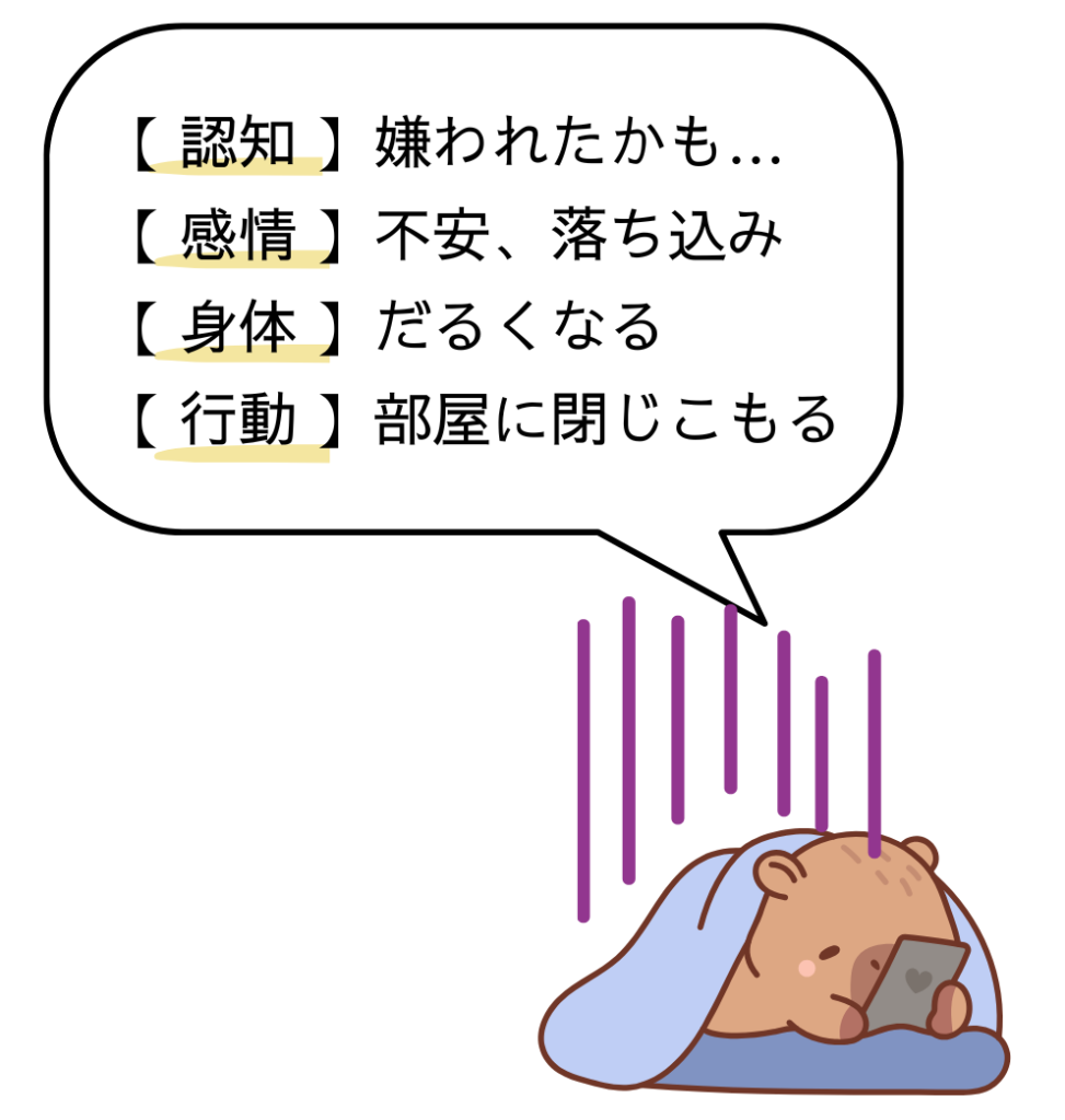 「嫌われたのかもしれない…」と考えれば(認知)、不安や落ち込み(感情)が強くなり、部屋に閉じこもる(行動)ことがあります。