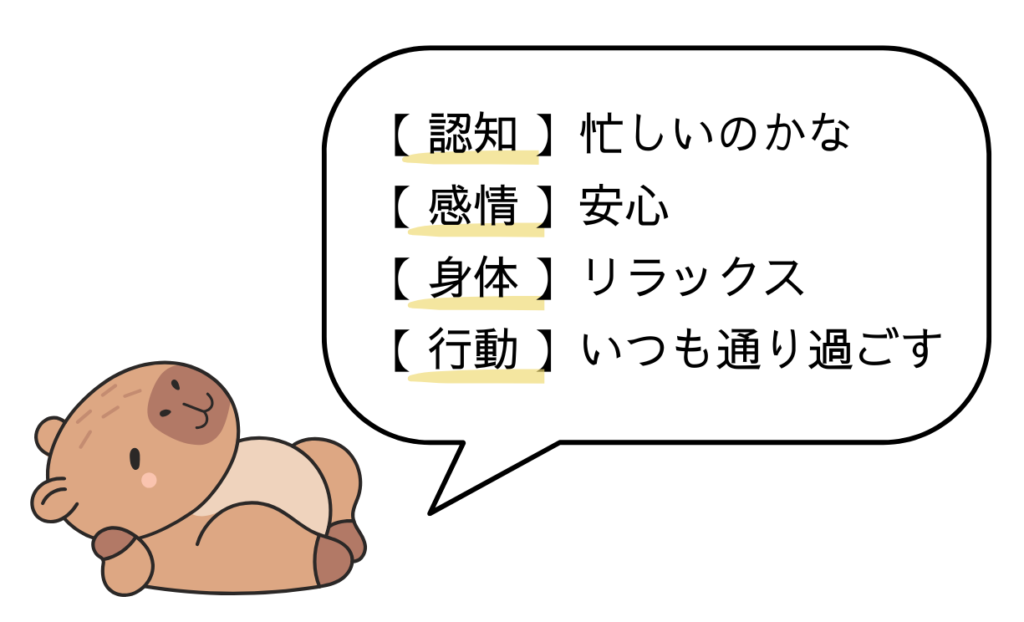 CBTでは、日常の中でどんな「認知」「感情」「身体反応」「行動」が起こるのかを整理していきます。以下は具体的な例です。